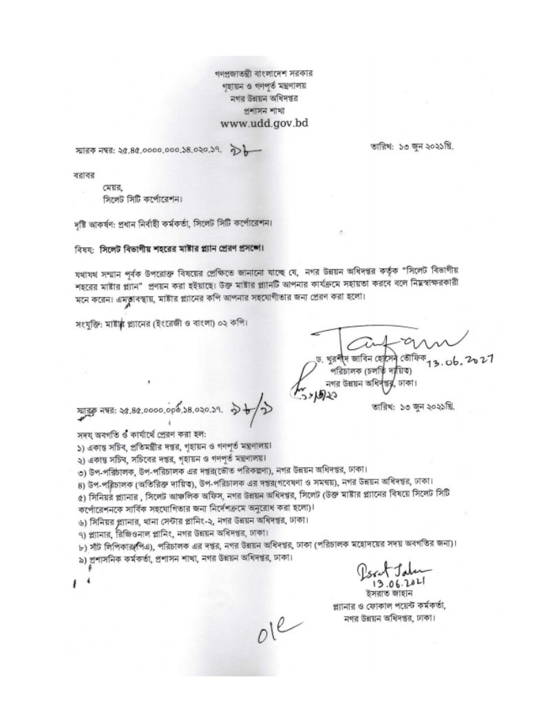 সিলেট সিটি কর্পোরেশনকে সিলেট বিভাগীয় শহরের মাষ্টার প্ল্যান (বাংলা ও ইংরেজী) প্রেরণ করা হয়েছে।